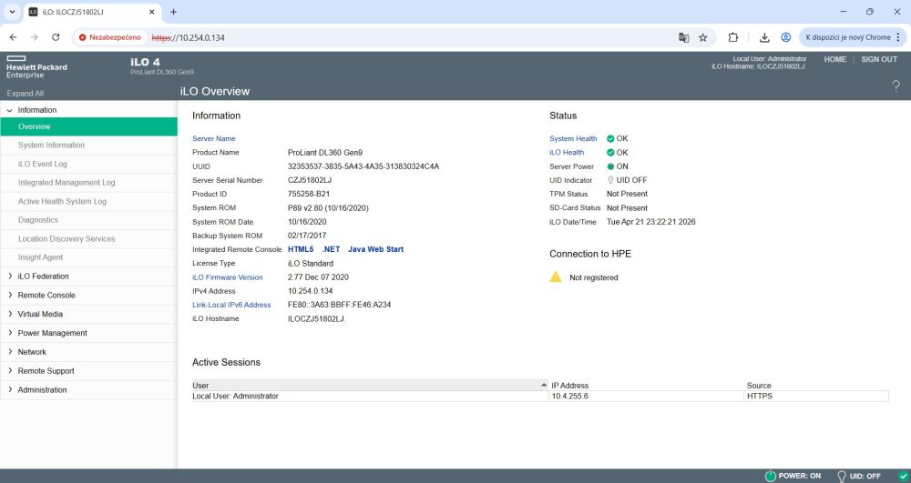 Nastavení iLO: dhcp / uživatel: Administrator / heslo: ADMIN.123